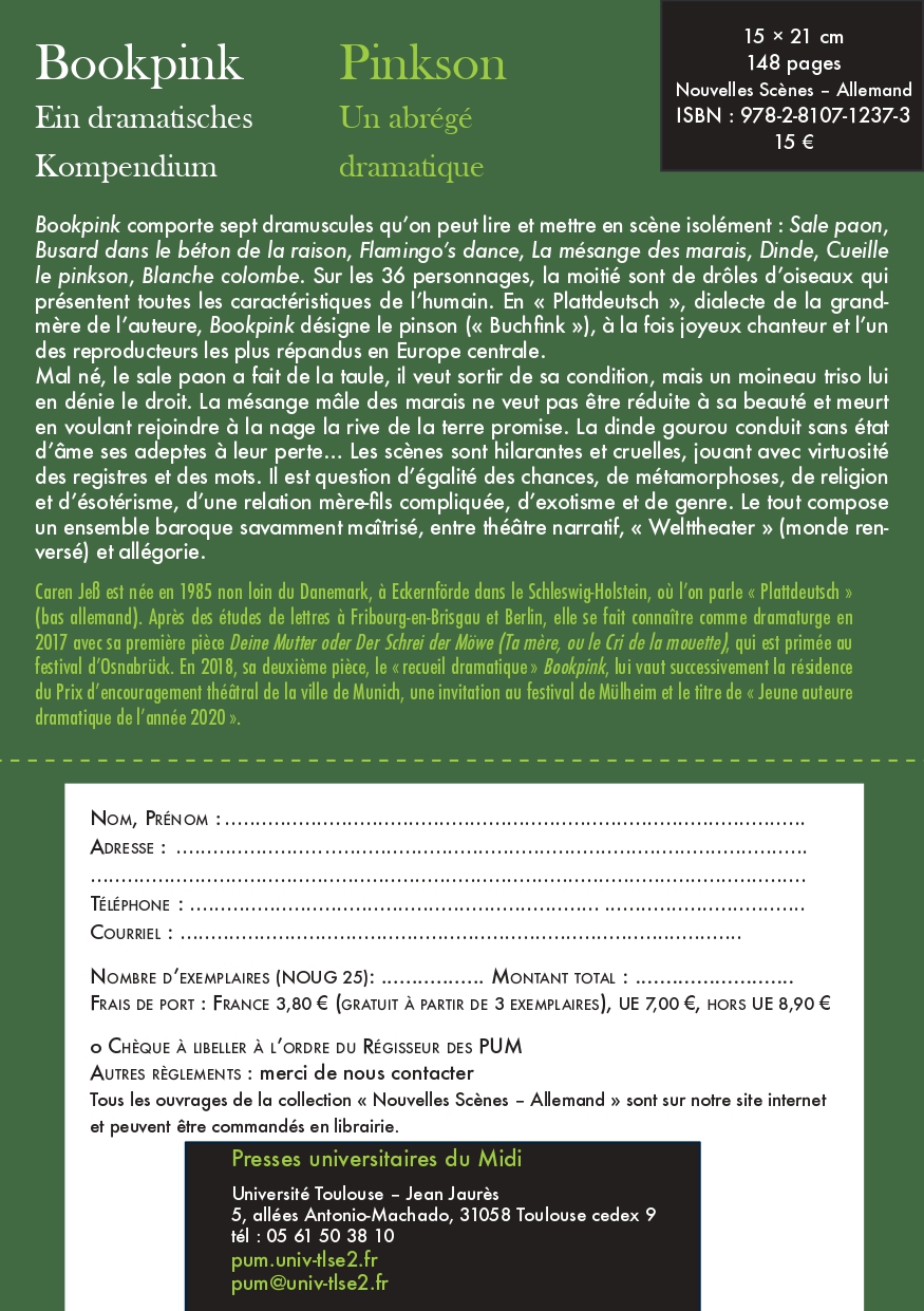 « Bookpink, qui signifie « pinson » en bas-allemand, est un texte composé de sept dramuscules (ou Dramolette), soit sept petites pièces indépendantes les unes des autres, qui mettent en scène 36 personnages, dont la majeure partie sont des oiseaux. On y découvre un paon au plumes sales, rabaissé par un moineau ; un busard retranché dans un hangar en béton ; des flamants roses qui planifient leur fuite hors d’une chambre d’enfant ; une communauté de mésanges endeuillée qui se recueille ; une dinde soi-disant énergéticienne ou encore une colombe qui rêve d’un monde baroque... Une proposition originale, où l’on croise non seulement des figures animales, mais aussi, parfois, végétales ou même (peut-être) humaines telles que l’« assistance » ou l’« humeur du jour ». Une forme poético-ludique, surprenante et décalée, et qui, derrière une légèreté apparente, reflète pourtant des trajectoires humaines brisées, en proie à l’absurdité de l’injustice ou menant une existence solitaire – comme si les oiseaux tendaient un miroir aux humains... » Charlotte Bomy